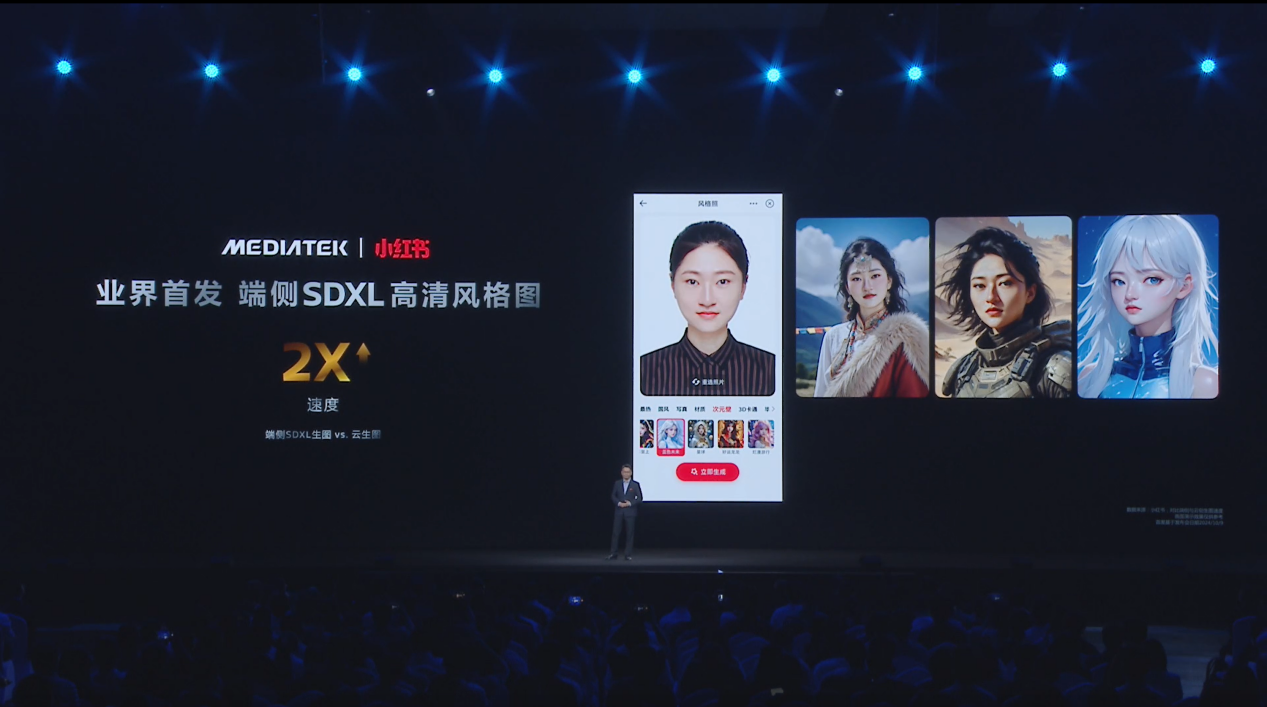 而在功能落地方面,联发科已经和小红书深度合作,首发推出端侧 SDXL 高清风格图,可以将用户的个人照片通过端侧的 AI 处理生成各种风格的魔幻照片,而且相比云端平均生成时长还要快 2 倍,本地 AI 运算快速的优势体现出来了。
