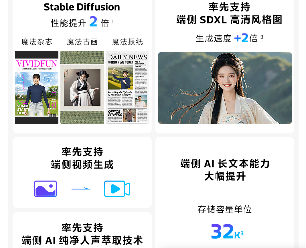而在其他多模态生成能力方面,天玑 9400 可以实现 50 Token / s 的先进多模态输出能力,且支持图、文、声随意输入需求,以及多专家模型(MoE)完整适配,端侧长文本输出能力也达到 32K Tokens,相比天玑 9300 提升了 8 倍。在这些能力的加持下,搭载天玑 9400 的终端将不仅支持图生图,还能实现生动图。
