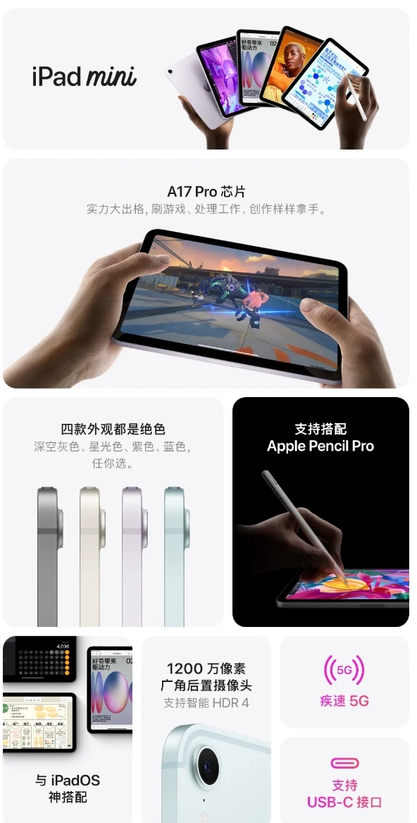 凤凰网科技讯 10月15日,苹果今晚通过新闻稿的方式突然发布了第七代iPad mini。这是自2021年以来,苹果这款最小平板的首次升级。新款iPad mini搭载了更快的 A17 Pro 芯片,支持Apple Intelligence,增大了入门档存储空间,并支持 Apple Pencil Pro。新款iPad Mini起售价为3999元,10月17日上午9点开始预购,10月23日正式发售。