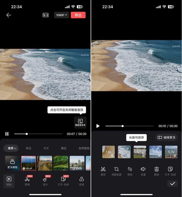 如果你觉得这样拍出来的视频还是差点意思,就能在DJI FlyAPP中选择一键出片,它能根据短片的内容和场景自动选择合适的模板,当然这一切都是可以自行调整的。