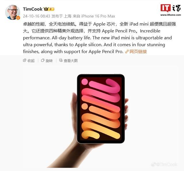 IT之家 10 月 16 日消息,苹果昨晚推出 iPad mini 7 平板电脑后,该公司首席执行官蒂姆・库克(Tim Cook)今天发布微博,称该平板具备卓越的性能,全天电池续航。