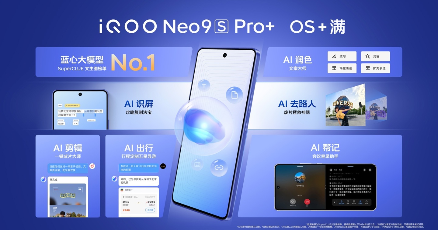 iQOO Neo9S Pro+ 系统内置 vivo 蓝心大模型,支持 AI 识屏、AI 去路人、AI 剪辑、AI 润色、AI 出行、AI 帮记等功能。