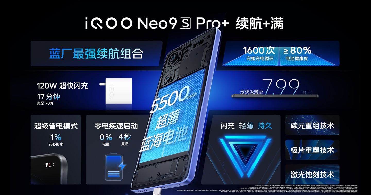 iQOO Neo9S Pro+ 是 Neo 系列首款搭载蓝海电池的产品,采用 120W 超快闪充和等效 5500mAh 超薄蓝海电池的组合,最快 17 分钟可充至 70%,最快 28 分钟充至 100%;完整充电循环 1600 次,电池健康度≥80%。玻璃版手机厚 7.99mm,重 198g,素皮版厚 8.34mm,重 193g。