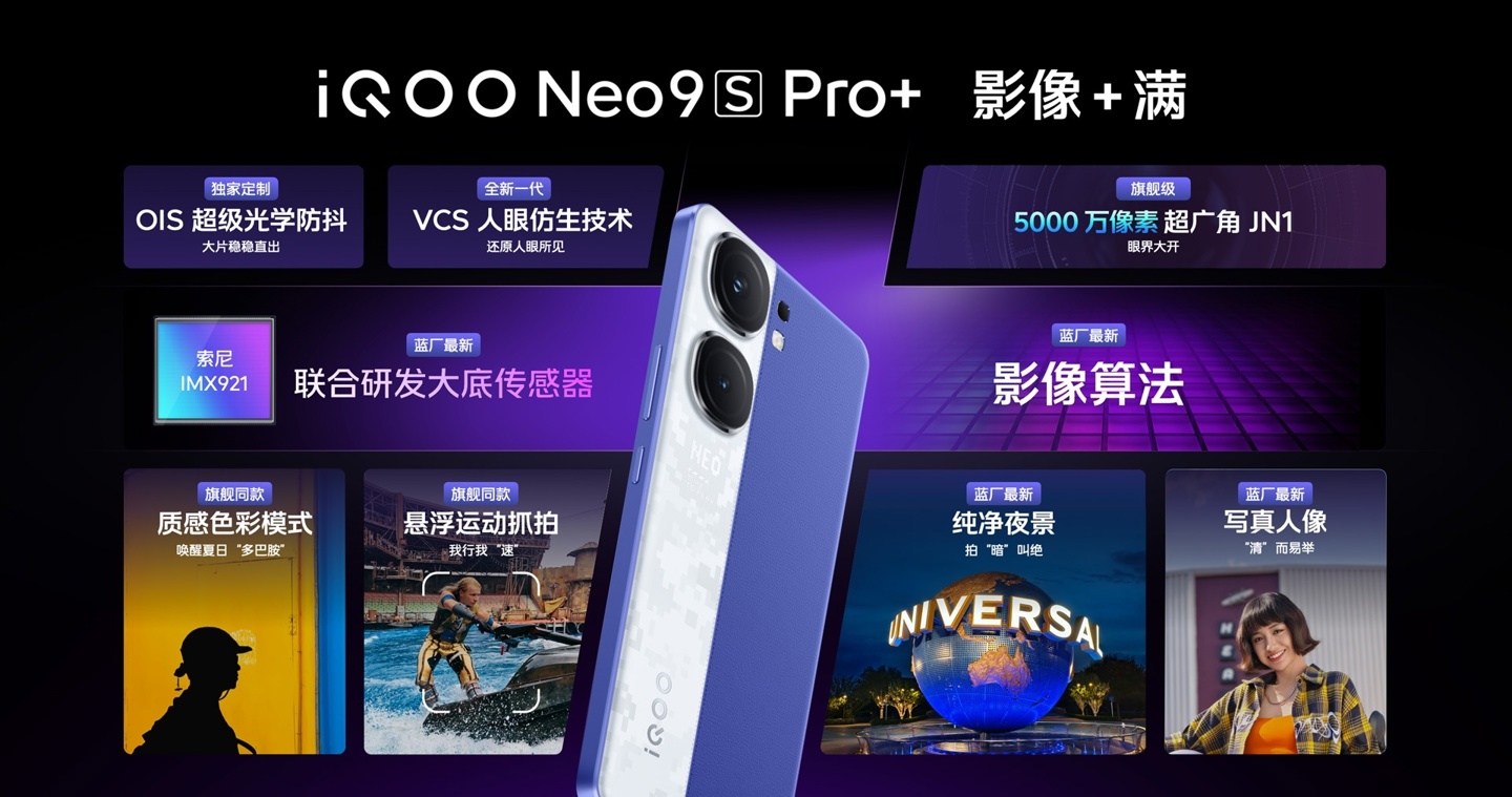 iQOO Neo9S Pro+ 前置 16MP(三星 S5K3P9,1/3.1 英寸)摄像头,后置 50MP 主摄(索尼 IMX921,1/1.49 英寸,OIS)+50MP 超广角(三星 S5KJN1)双摄。搭载蓝厂最新影像算法:纯净夜景、写真人像。