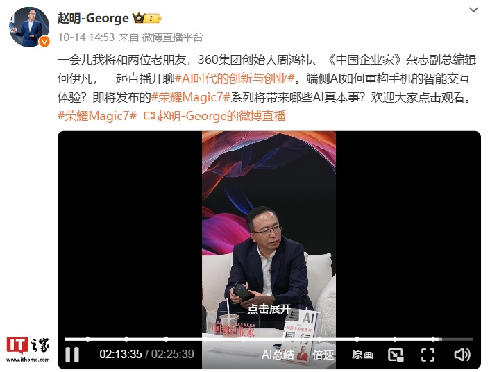 IT之家 10 月 16 日消息,荣耀终端有限公司 CEO 赵明与 360 集团创始人、董事长周鸿祎在 10 月 14 日开启 AI 讨论的直播活动。