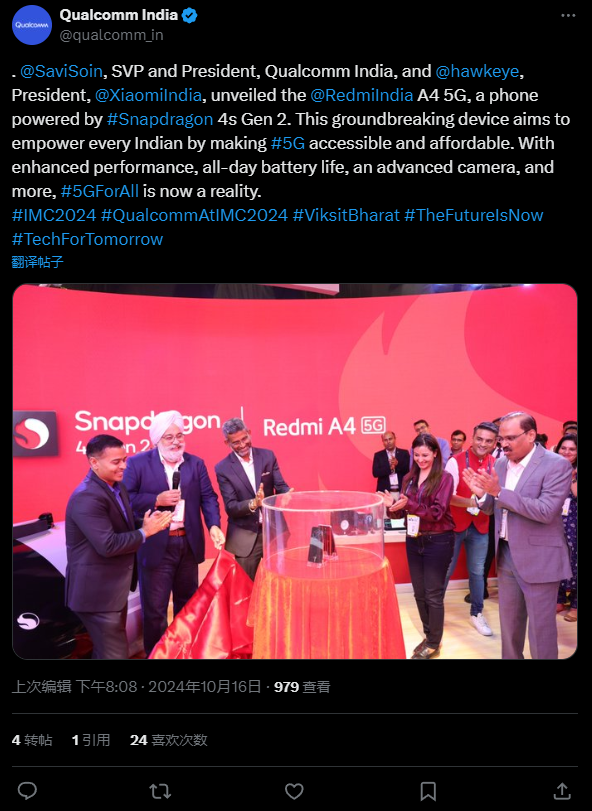 文章来源于互联网:IT之家-小米手机进入印度市场 10 周年:Redmi A4 5G 发布,全球首发高通骁龙 4s Gen2