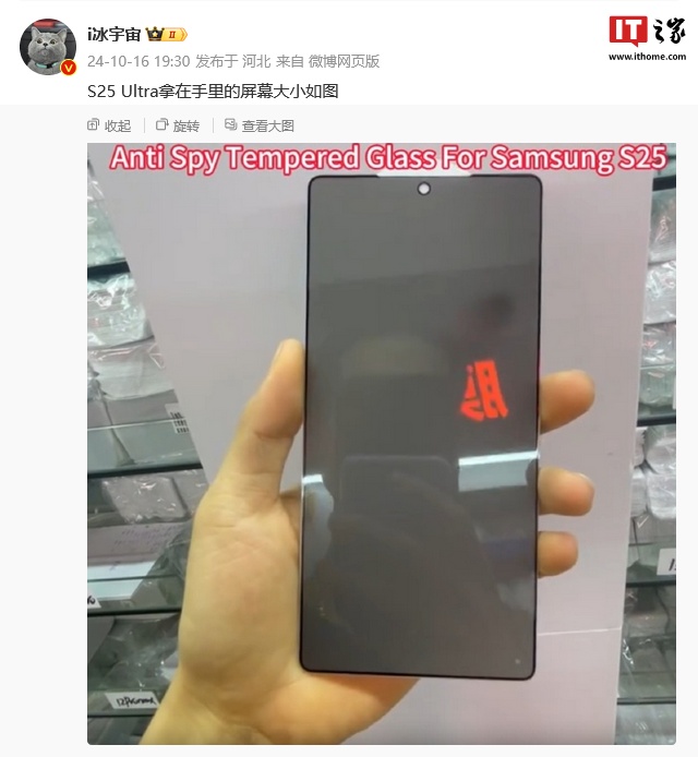 IT之家 10 月 17 日消息,数码博主 @i冰宇宙 昨日发布微博,分享了三星 Galaxy S25 系列手机的保护膜照片,并分享了 Galaxy S25 Ultra 手机的握持大小示意图。