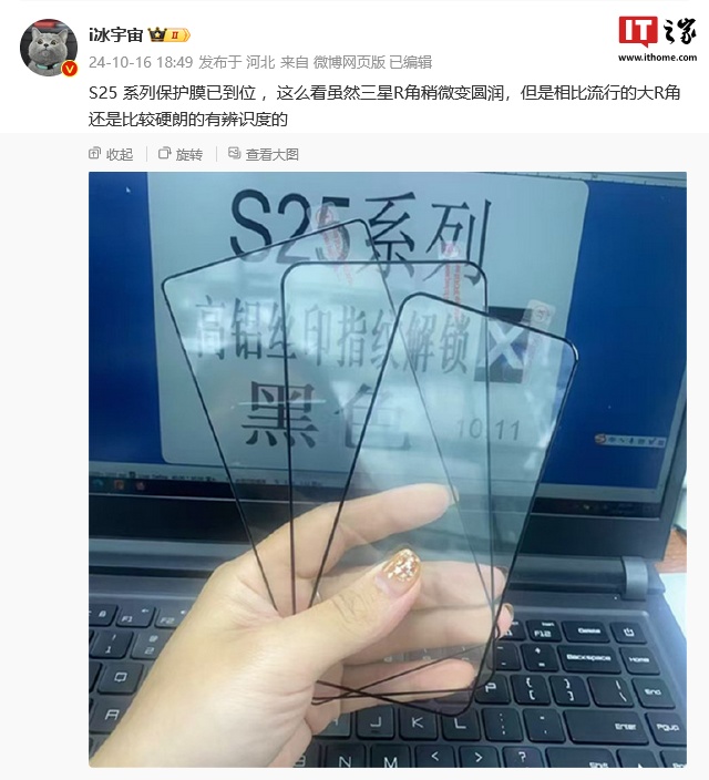 IT之家附上消息源内容如下:“S25 系列保护膜已到位,这么看虽然三星 R 角稍微变圆润,但是相比流行的大 R 角还是比较硬朗的有辨识度的”。
