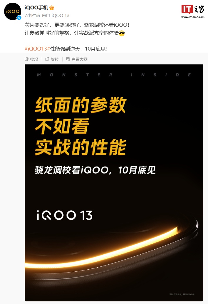 IT之家 10 月 17 日消息,iQOO 手机今日发文官宣,旗下 iQOO 13 手机 10 月底见,官方宣称“骁龙调校看 iQOO”。