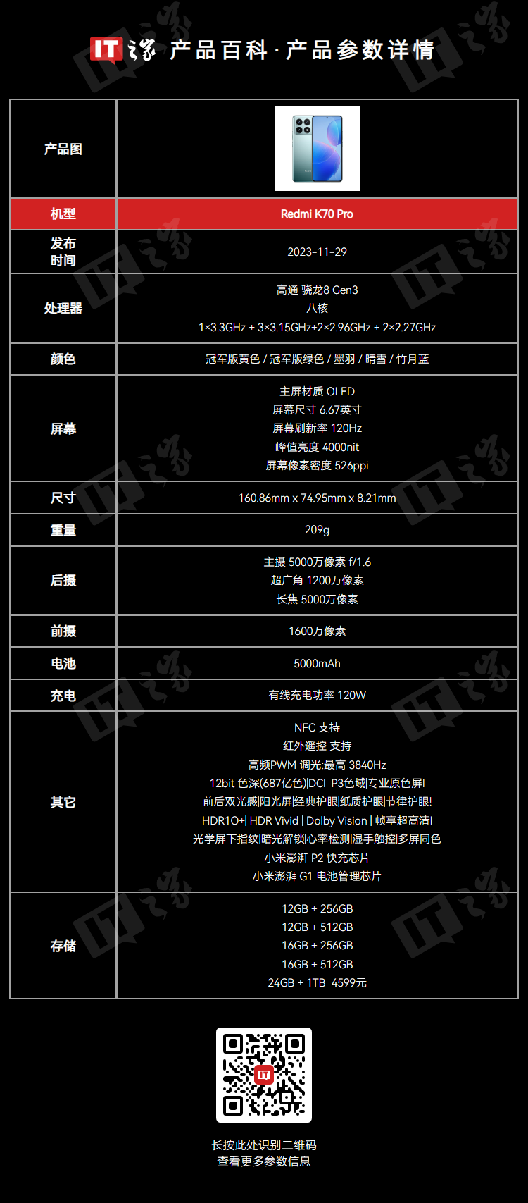 Redmi K70 Pro 手机发布于 2023 年 11 月 29 日,搭载高通骁龙 8 Gen 3 处理器,2K 屏幕采用华星 C8 发光材料,峰值亮度 4000 尼特、瞬时触控最高 2160Hz、支持湿手触控,详细参数见下方产品百科。