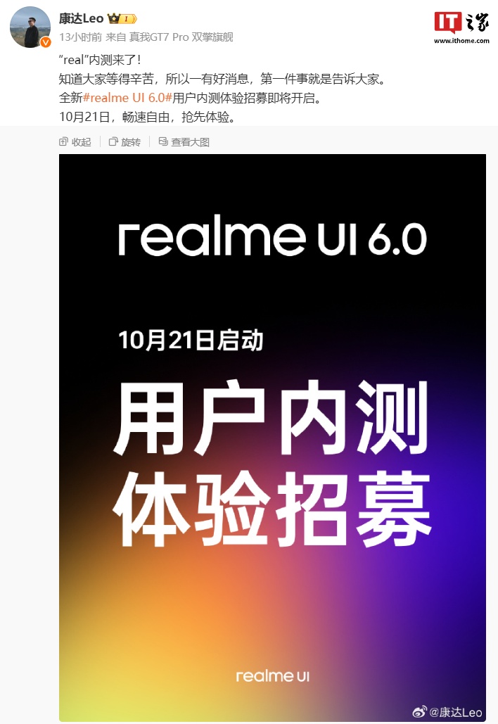 IT之家注意到,realme UI 产品经理 @康达Leo 今日发文宣布,真我 realme UI 6.0 用户内测体验招募将于 10 月 21 日启动,预计将招募支持 11 月升级的机型。