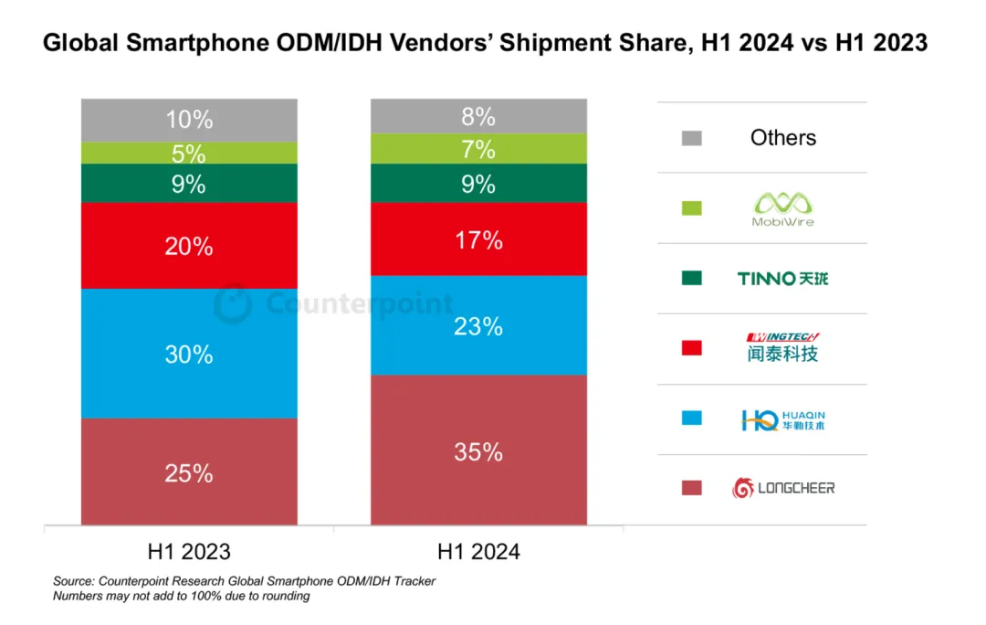 文章来源于互联网:IT之家-Counterpoint:龙旗领跑,2024 上半年外包设计(ODM / IDH)智能手机出货量同比增长 6%