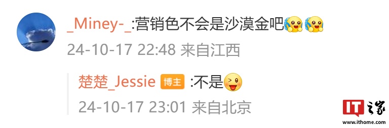在评论区这位营销总监表示,营销色不是沙漠金。而 realme 市场沟通总监 @宋琪Aric 则号称,“这是真我有史以来最棒的旗舰产品,性能屏幕续航影像综合体验全面超越期待。”