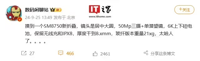 从电池信息来看,符合数码博主 @数码闲聊站 此前曝料信息,他此前发布微博:“摸到一个 SM8750 新折叠,镜头是居中大圆,50Mp 三摄 + 单潜望镜,6K 上下硅电池,保留无线充和 IPX8,厚度干到 8.xmm,玻纤版本重量 21xg,太哈人了…”。
