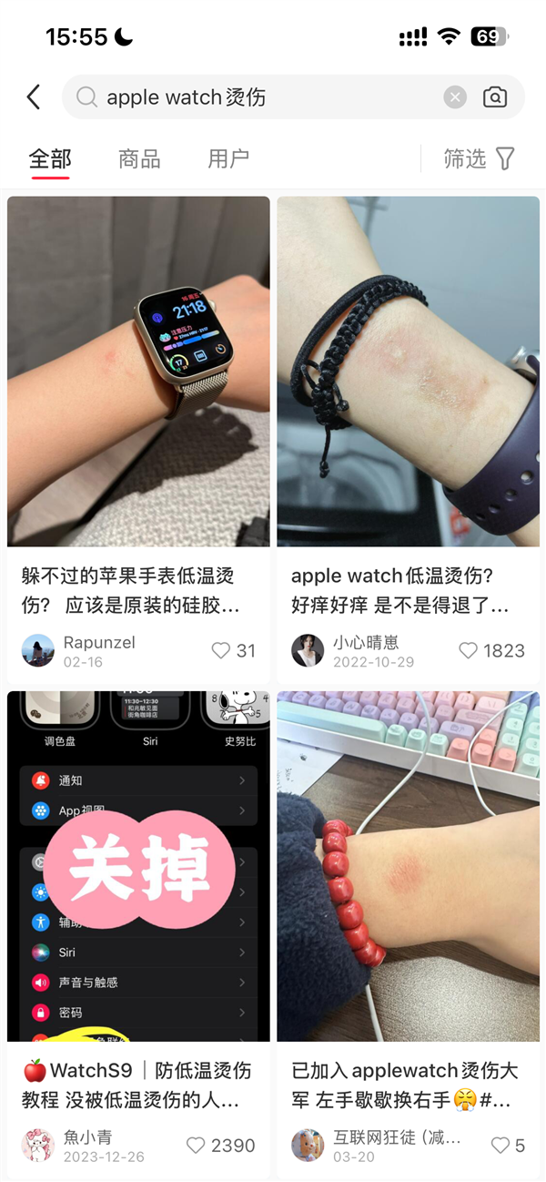 在小红书等平台搜索相关关键词后,可以看到“已加入Apple Watch烫伤大军”“Apple Watch低温烫伤”等类似反馈内容。