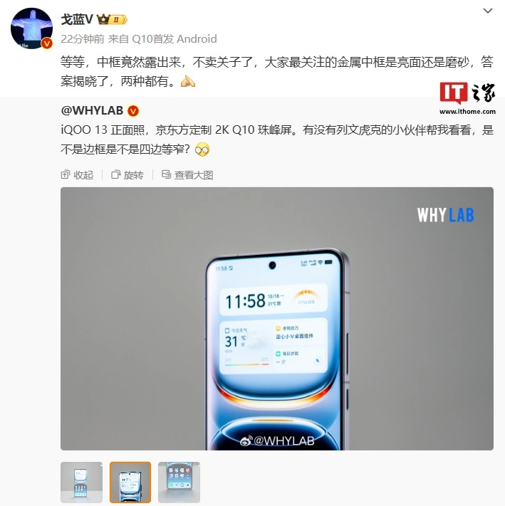 另外,据 @戈蓝V 透露,iQOO 13 手机中框还采用金属材质,将提供亮面和磨砂 2 种质感。