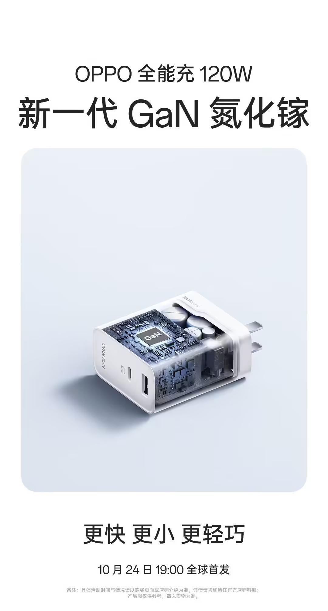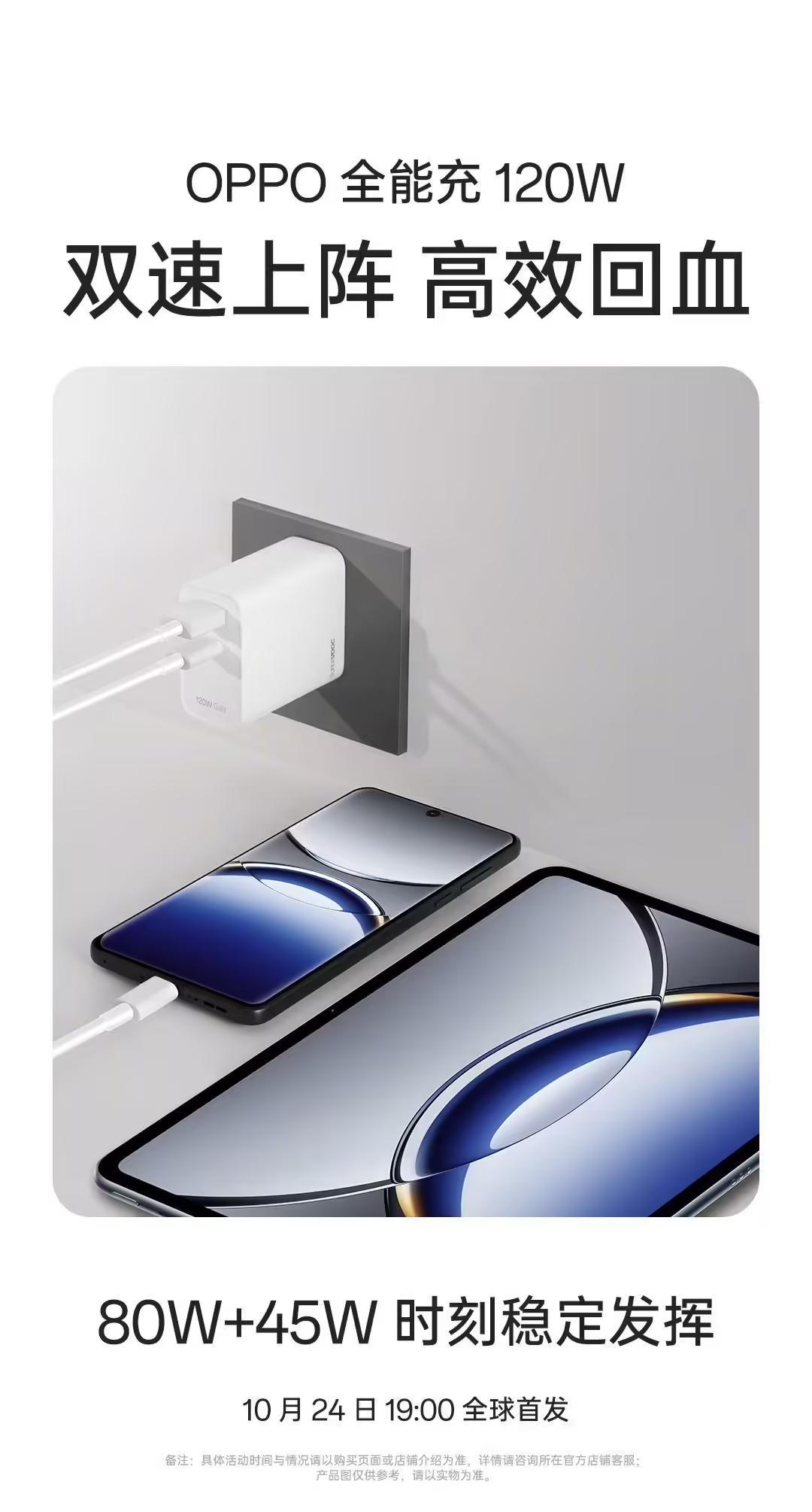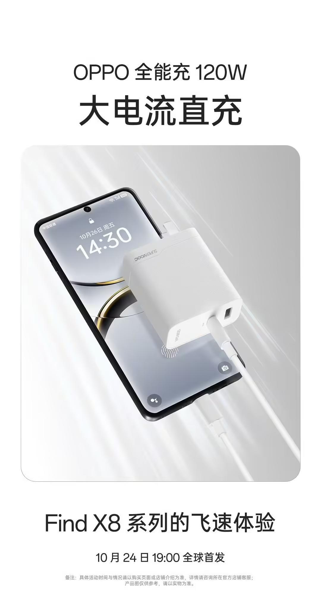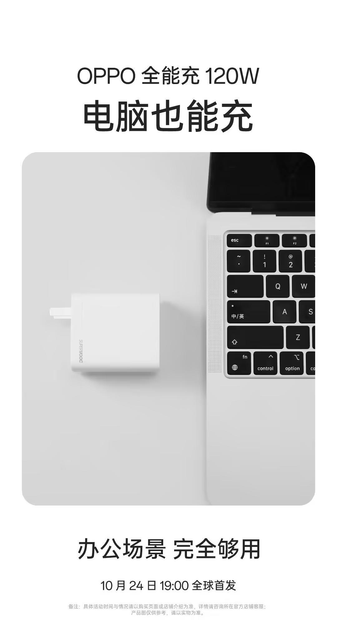 预热海报显示,OPPO 120W 全能充采用新一代氮化镓技术,支持大电流直充,适配 Find X8 系列手机快充,充电器还适配电脑使用。