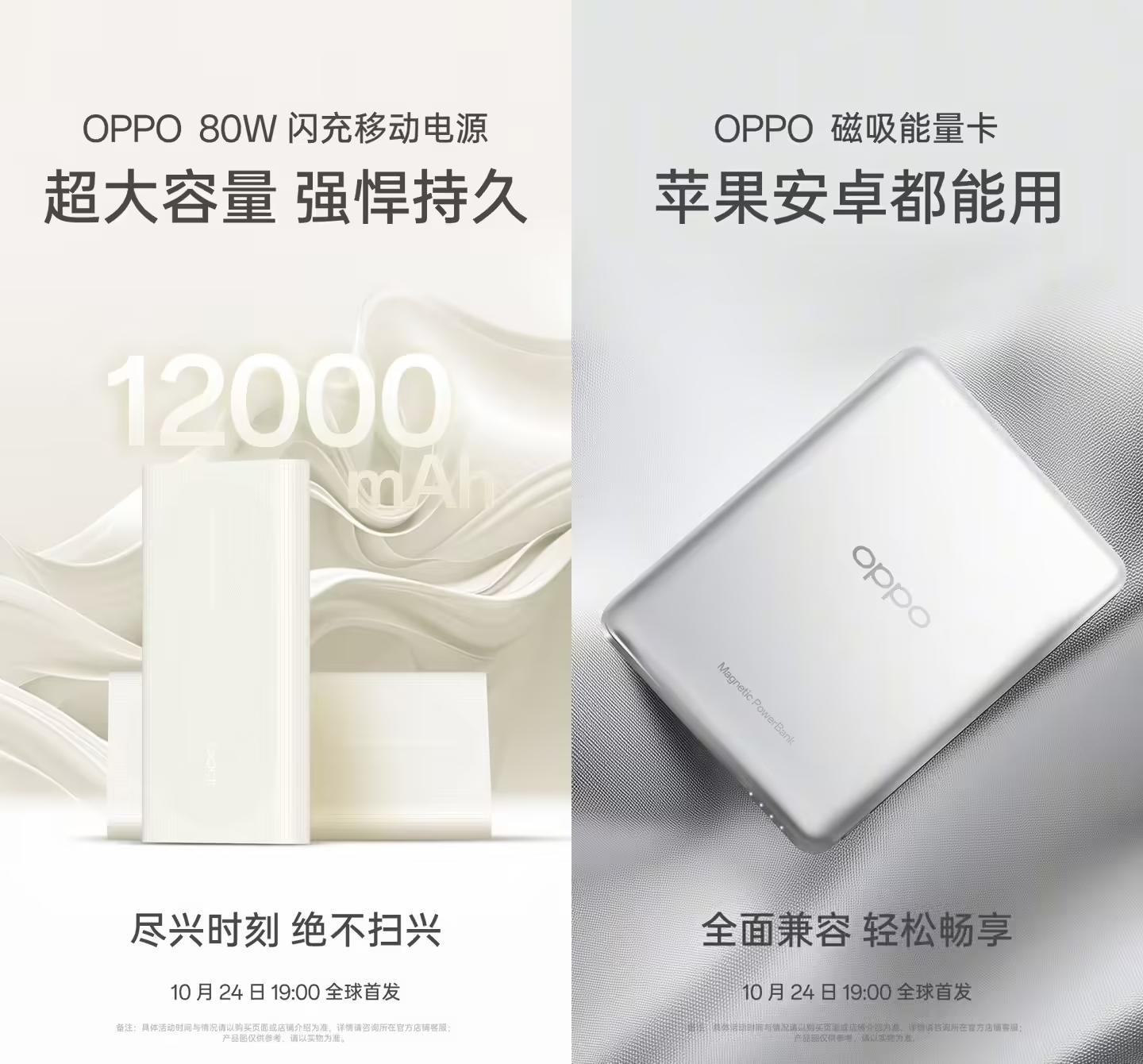 据IT之家此前报道,OPPO 80W 闪充移动电源、磁吸能量卡移动电源均已开启预热,将于 2024 年 10 月 24 日亮相。其中,磁吸能量卡移动电源约 0.88cm 厚、支持苹果安卓使用;80W 闪充移动电源拥有 12000mAh 容量、可上飞机。