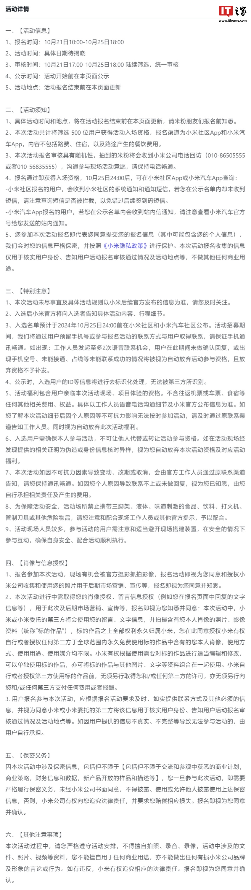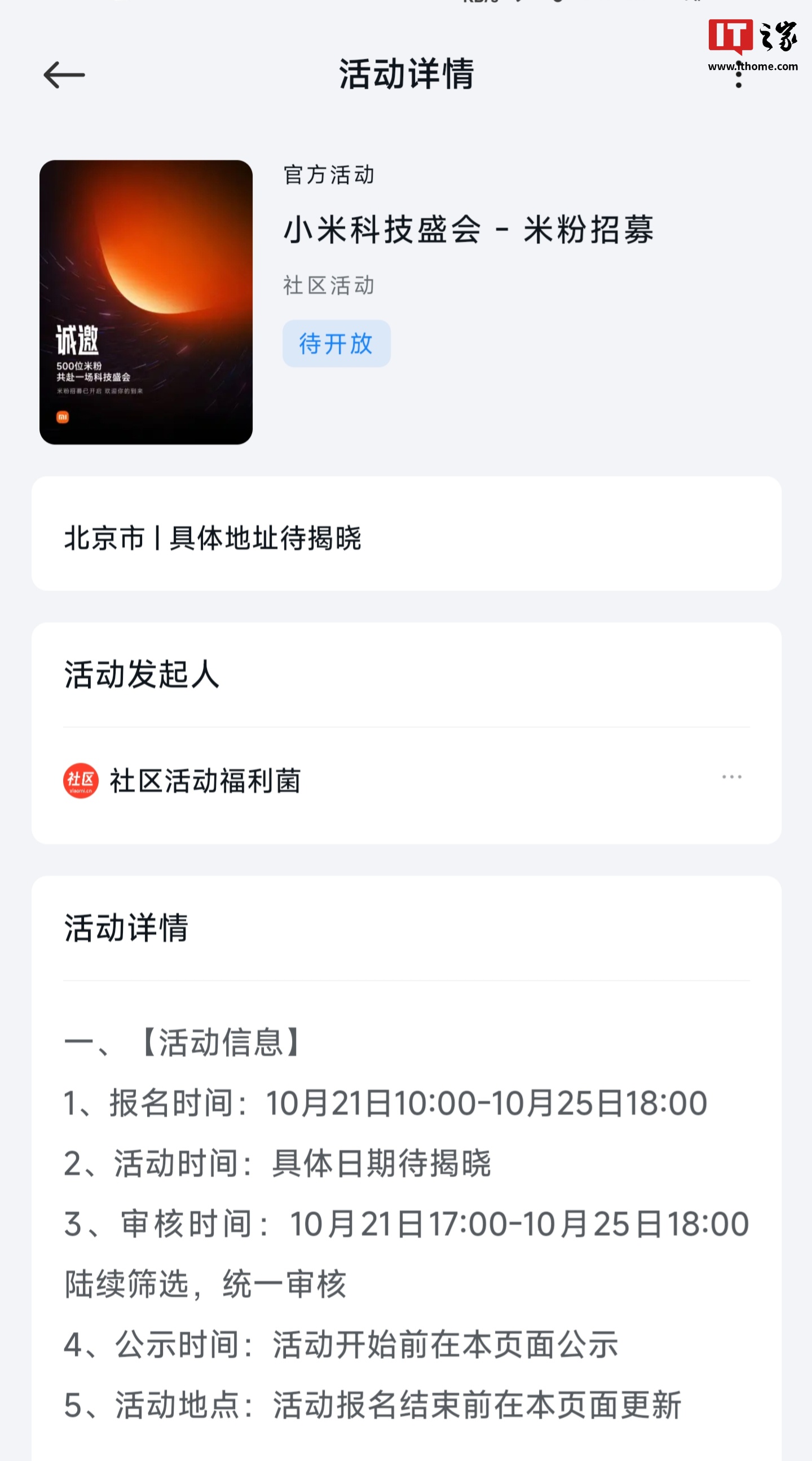 IT之家 10 月 21 日消息,小米社区今日开启“小米科技盛会”米粉招募,共招募 500 人,报名时间为 10 月 21 日 10 时至 10 月 25 日 18 时,活动具体日期待揭晓。