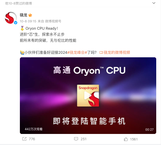 在 10 月 8 日,@骁龙 官方微博就宣布下一代骁龙旗舰移动平台采用高通 Oryon CPU,将于北京时间 10 月 22-24 日在骁龙峰会上发布。同时还发布了一则预热视频。