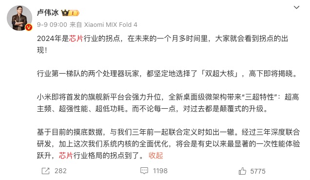 此前,小米集团总裁卢伟冰层在微博表示:“2024 年是芯片行业的拐点。行业第一梯队的两个处理器玩家,都坚定地选择了‘双超大核’。