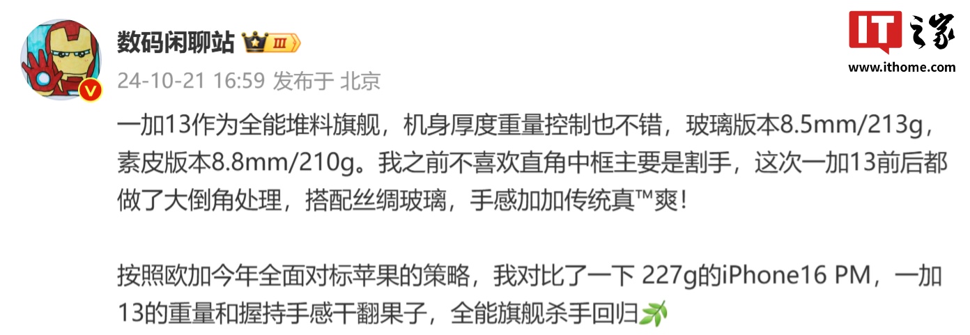 博主 @数码闲聊站 今日透露,一加 13 手机有两种材质,其中玻璃版本 8.5mm / 213g,素皮版本 8.8mm / 210g。