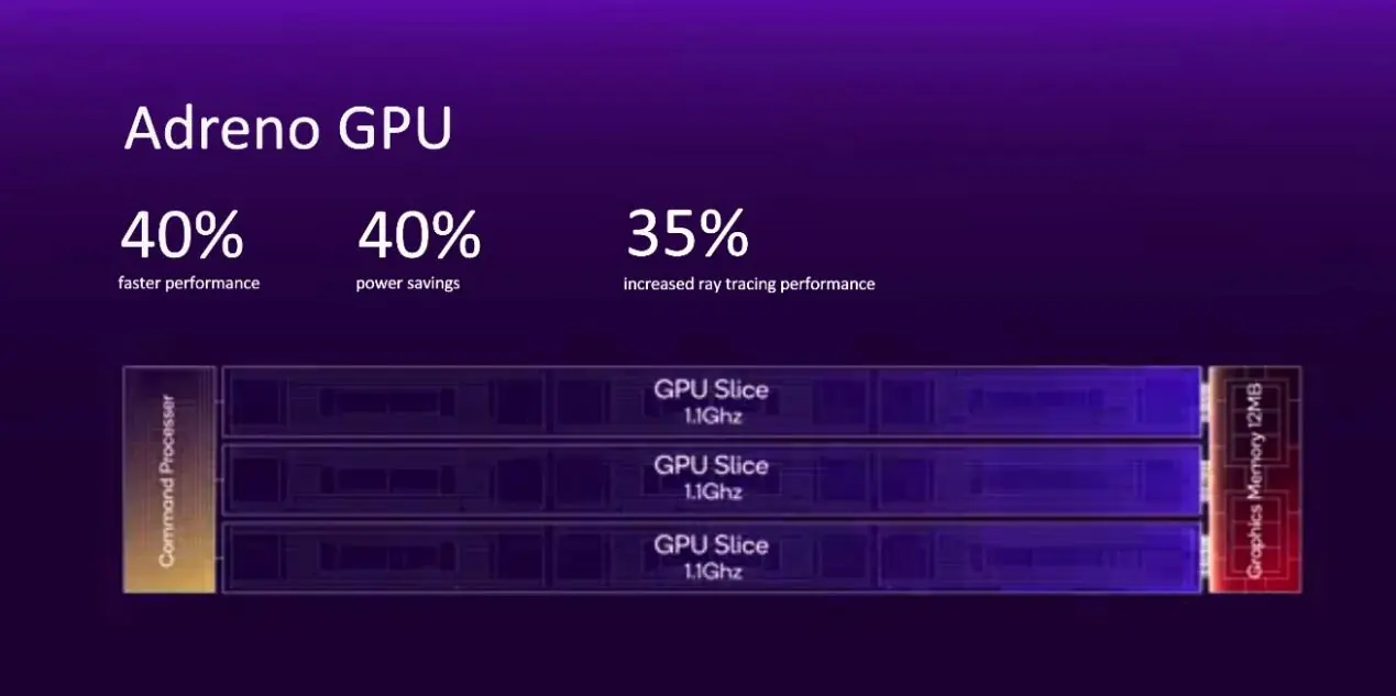 性能和能效大升级的背后,Adreno 830 GPU 在整体架构上也作出了重要变革,这一代 GPU 在渲染来源层面上分为了三个 Slice,每一个 GPU Slice 都能达到 1.1GHz 的性能水平,这样设计的好处是可以根据用户的需求进行灵活地调配。因此在骁龙 8 至尊版上高通也为 GPU 增加了一个整体的调控引擎(Commond Processor)。
