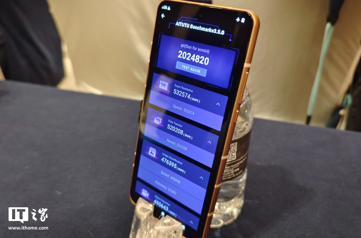 在 AI 性能方面,IT之家也使用骁龙 8 至尊版工程机做了测试,首先是 AITUTU Benchmark v3.5.0 的测试,骁龙 8 至尊版达到了 2024820 分,其中 Super Resolution(超分)为 532574 (SNPE),Style Transfer(图像风格迁移)为 520208 (SNPE),Image Classification 为 476395 (SNPE)。