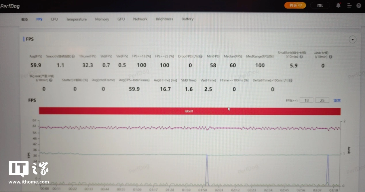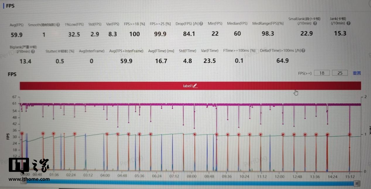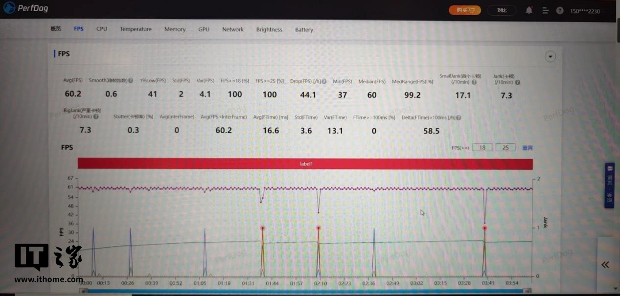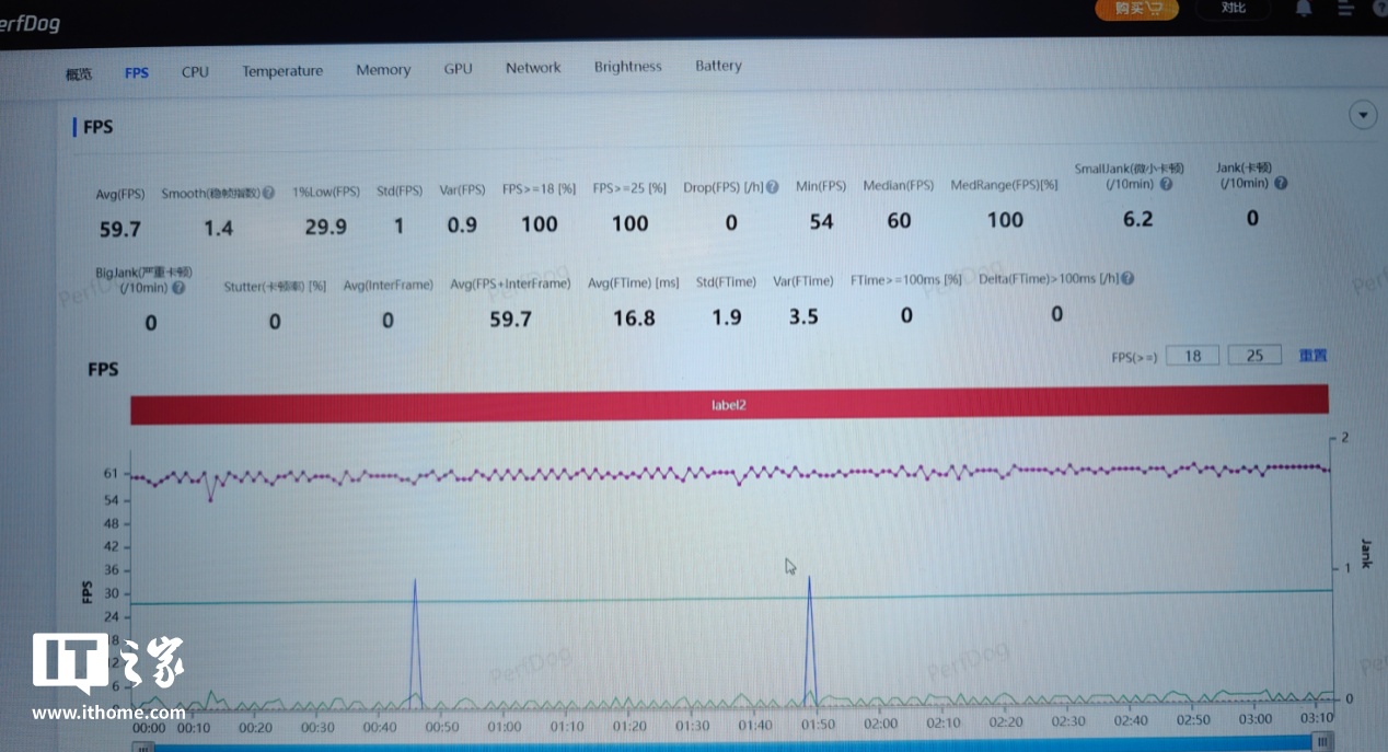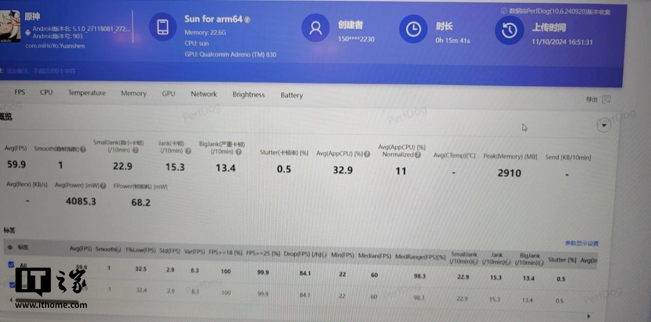 测试结束后,可以看到游戏运行的平均帧率为 59.9fps,看帧率曲线几乎也是一条直线。需要说明的是,帧率曲线中间歇性的瞬时掉帧,经确认是由于测试当天《原神》游戏版本更新产生的问题,与骁龙 8 至尊版的性能表现无关。如果将这些瞬时掉帧去掉,可以看到游戏运行的帧率曲线确实基本就是一条直线,非常平稳。