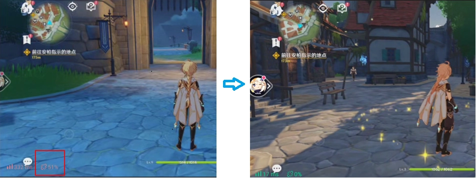 云游戏场景,网络质差时卡顿严重,部分画面严重失真。使能 NWDAF 智能化的按需保障后,识别签约保障的云游戏数据流后,为此数据流按需建立专载保障并提高调度优先级后,云游戏卡顿次数明显减少,丢 / 掉帧率降低了 50% 以上。丢 / 掉帧率保障前后对比如下图(可以看出是《原神》,前段为保障前,后段为保障后):