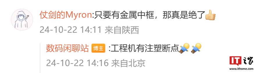 IT之家注意到,博主在评论区称“工程机有注塑断点”,意味着这台新机采用金属中框。