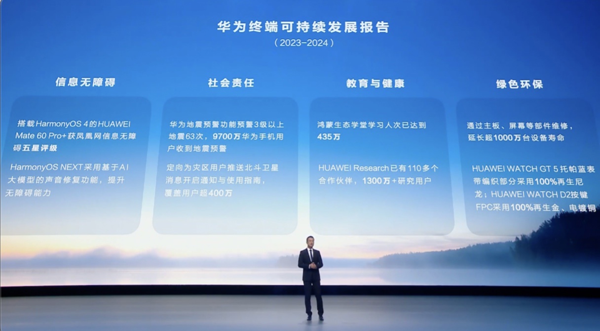 IT之家 10 月 22 日消息,在目前正在进行的原生鸿蒙之夜暨华为全场景新品发布会中,《华为终端可持续发展报告(2023-2024)》正式公布。