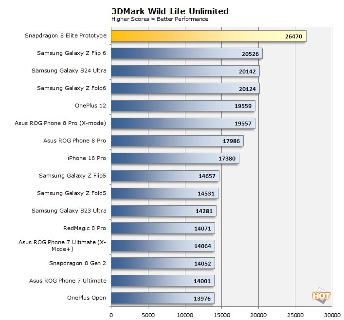 在固定分辨率下运行《Wild Life Unlimited》,骁龙 8 至尊版芯片超过了所有评测的竞争对手。