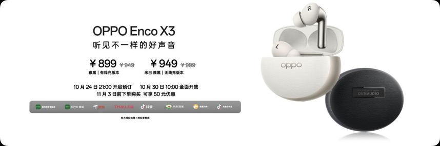 OPPO Enco X3有线充版本提供雅黑配色,售价为899元。Enco X3无线充版本提供米白和雅黑两种配色,售价为999元。