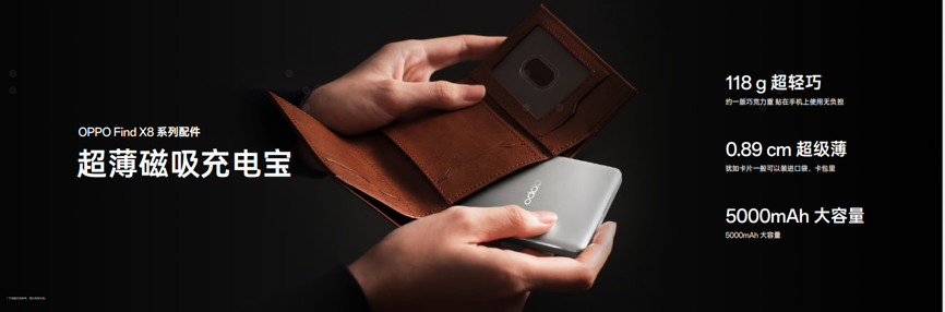 同时Find X8系列推出了全新的OPPO Mag磁吸配件系列。5000mAh超薄磁吸充电包厚度仅为0.89cm,重量也只有118g,可以轻松地快速补充电量。