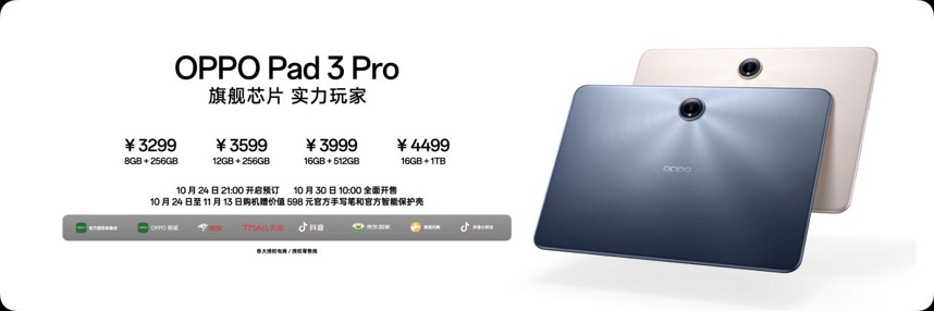 OPPO Pad 3 Pro共有8GB+256GB、12GB+256GB、16GB+512GB以及16GB+1TB等4个版本,提供晨曦金与夜幕蓝两种配色供用户选择,3299元起售。