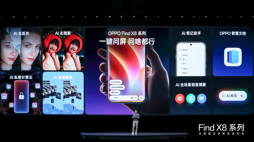 Find X8系列配备一键问屏,只需一键,OPPO AI便可被唤醒,可快速唤起 AI 助手,支持“一键问屏,问啥都行”,还有 AI 消除、AI 去反光、AI 去拖影、AI 超清像素等功能,可帮助用户拯救废片。此外,Find X8系列带来全面升级的互传功能,并支持与iPhone系列的互传。全新的互传支持碰传,通过设备的靠近即可完成照片、文件的分享。