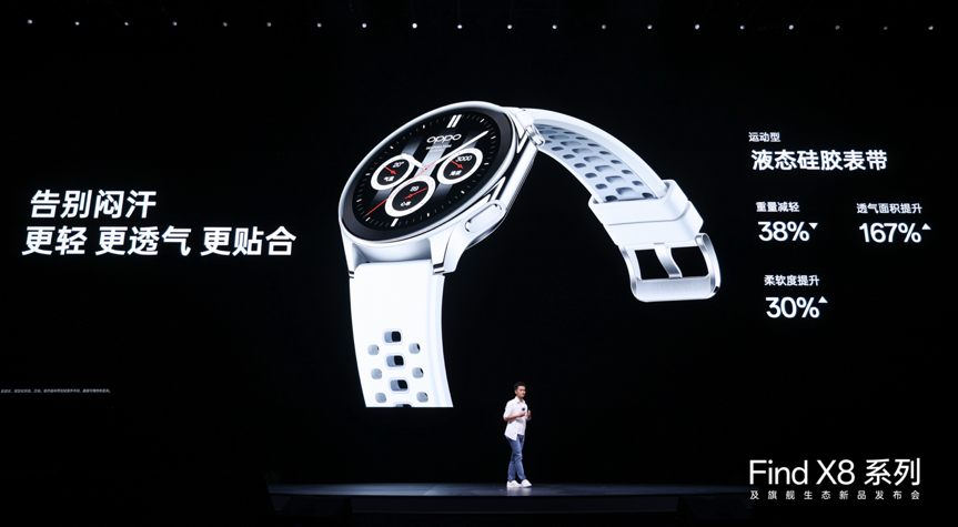 智能手表新标杆OPPO Watch X冰川岩灰也一同亮相。新版本采用液态硅胶材质表带,相比普通表带减重10g,透气面积增加60%,更轻、更透气、更贴合手腕,长时间运动佩戴不闷汗。