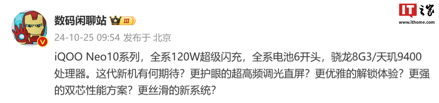 博主 @数码闲聊站 今日透露,这两款机型为 iQOO Neo10 系列手机,全系支持 120W 超级闪充,全系电池 6 开头,搭载骁龙 8 Gen3 / 天玑 9400 处理器。