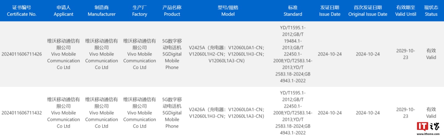 IT之家 10 月 25 日消息,型号为 V2425A、V2426A 的 vivo 新机于昨日(10 月 24 日)通过了 3C 质量认证。