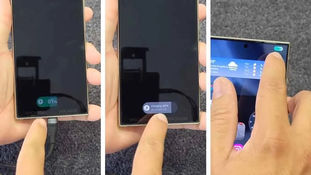 One UI 7 为主屏幕和锁屏引入了全新的充电动画,在连接充电器后,会出现一个动态的充电指示条。这个指示条同时作为充电进度条,显示正在充电的状态以及充电百分比。