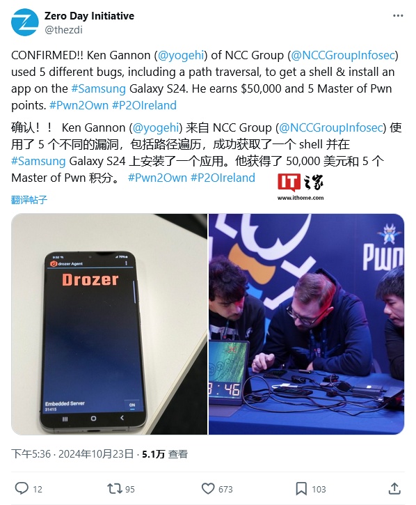 文章来源于互联网:IT之家-Pwn2Own 黑客大赛:专家利用 5 个漏洞入侵三星 Galaxy S24 手机斩获 5 万美元奖金