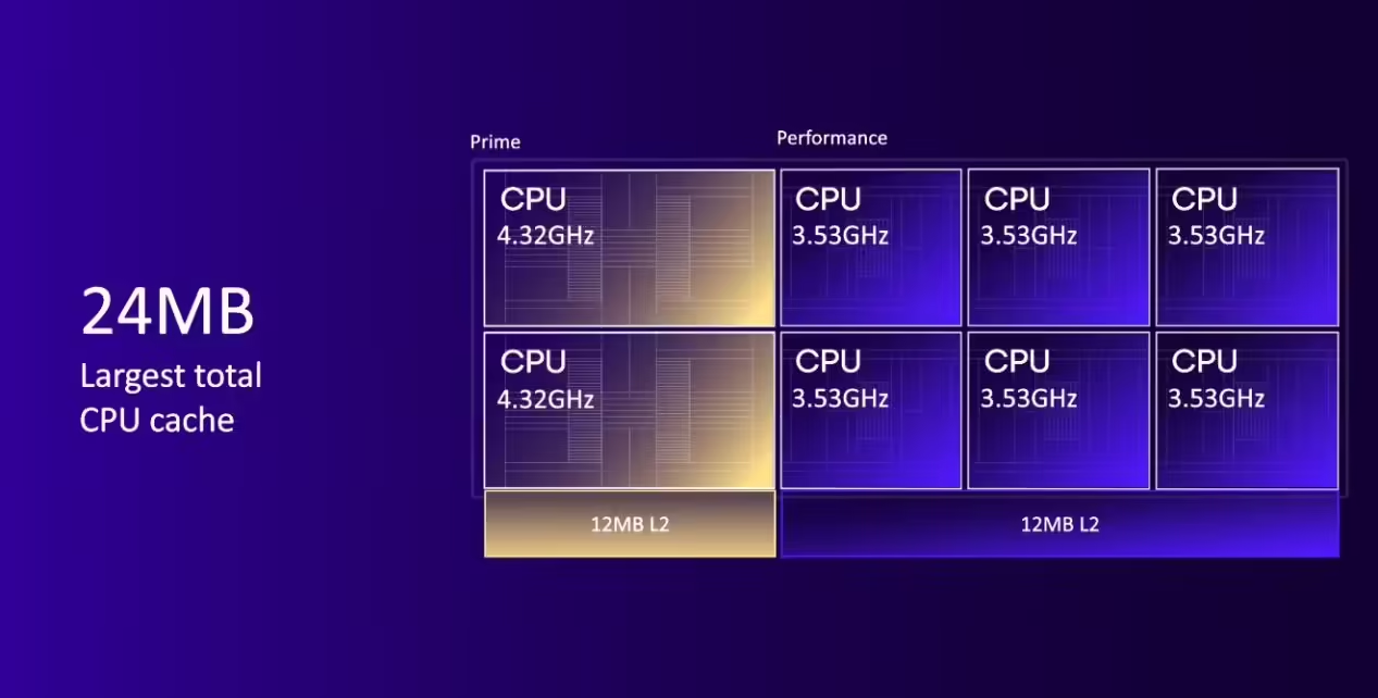 骁龙 8 至尊版上 Oryon CPU 的核心架构,本质上这是一枚全大核的架构,包括两个最高主频 4.32GHz 的 Phoenix L 超大核心和 6 个最高主频 3.53GHz 的 Phoenix M 大核心。