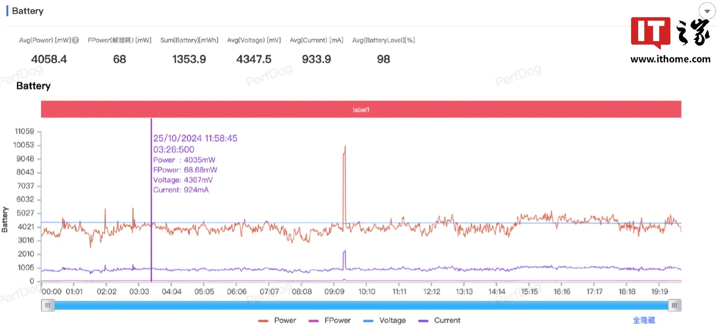 Perfdog 的数据证明了这一点,电池功耗选项显示,小米 15 Pro 的《原神》功耗为 4W 左右,帧能耗仅为 68mW。
