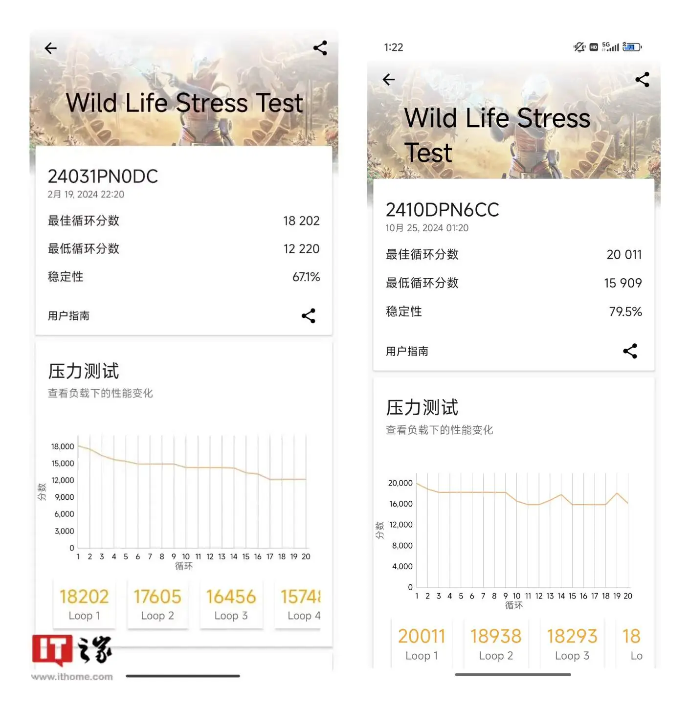 IT之家选择了连续 20 轮高强度 Wild Life,小米 15 Pro 的稳定性在 79.5%,最高分超过 2w,最低分为 15909。作为对比,小米 14 Ultra 稳定性在 67.1%,最低循环分数为 12220。