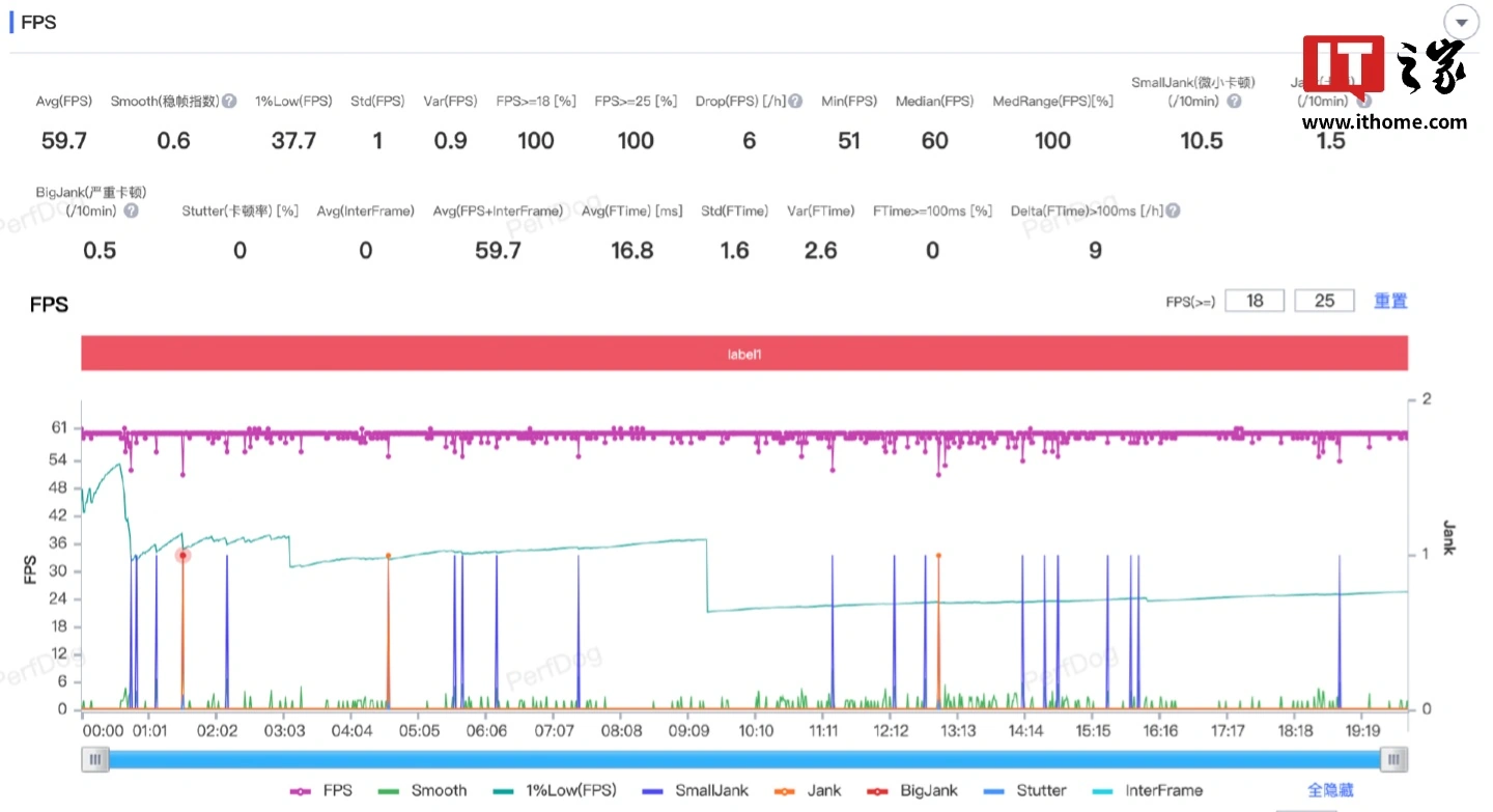 如上图所示,20 分钟的游戏中,小米 15 Pro 拿下了 59.7fps 的平均帧率表现,游戏跑图过程中全程稳帧,帧率波动的情况反而是游戏中的对话和交互所导致(实际肉眼无法感知),整体表现非常不错。