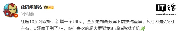 博主 @数码闲聊站 今日早些时候透露,红魔 10 系列手机双杯,新增一个 Ultra。红魔 10 系列手机搭载高通骁龙 8 Elite(骁龙 8 至尊版),全系采用定制高分屏下前摄纯直屏,尺寸都是 7 英寸左右, Ultra 版“好像干到了 7+”。