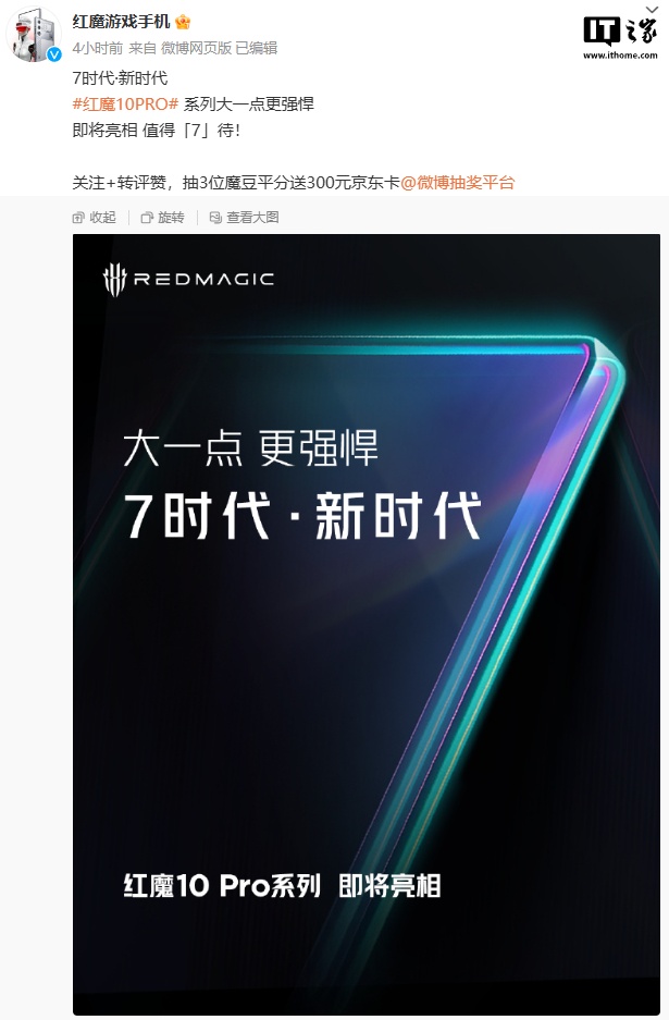 IT之家 10 月 25 日消息,红魔游戏今日宣布开启“7 时代・新时代”,红魔 10 Pro 系列即将亮相。从官方海报来看,预计新机将配备 7 英寸大屏。