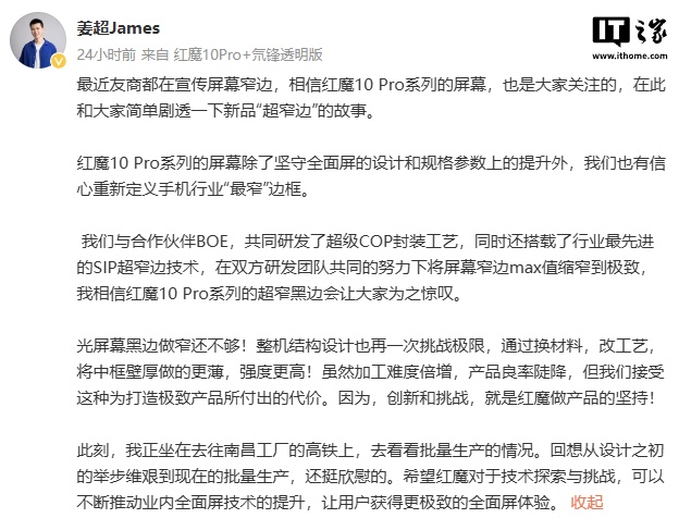 IT之家注意到,红魔游戏手机产品总经理 @姜超James 昨日发文透露,红魔 10 Pro 系列手机的屏幕除了全面屏设计和规格参数上的提升外,还将重新定义手机行业“最窄”边框。红魔与合作伙伴 BOE,共同研发了超级 COP 封装工艺,同时还搭载 SIP 超窄边技术。除屏幕外,整机结构设计通过换材料、改工艺,将中框壁厚做得更薄、强度更高。