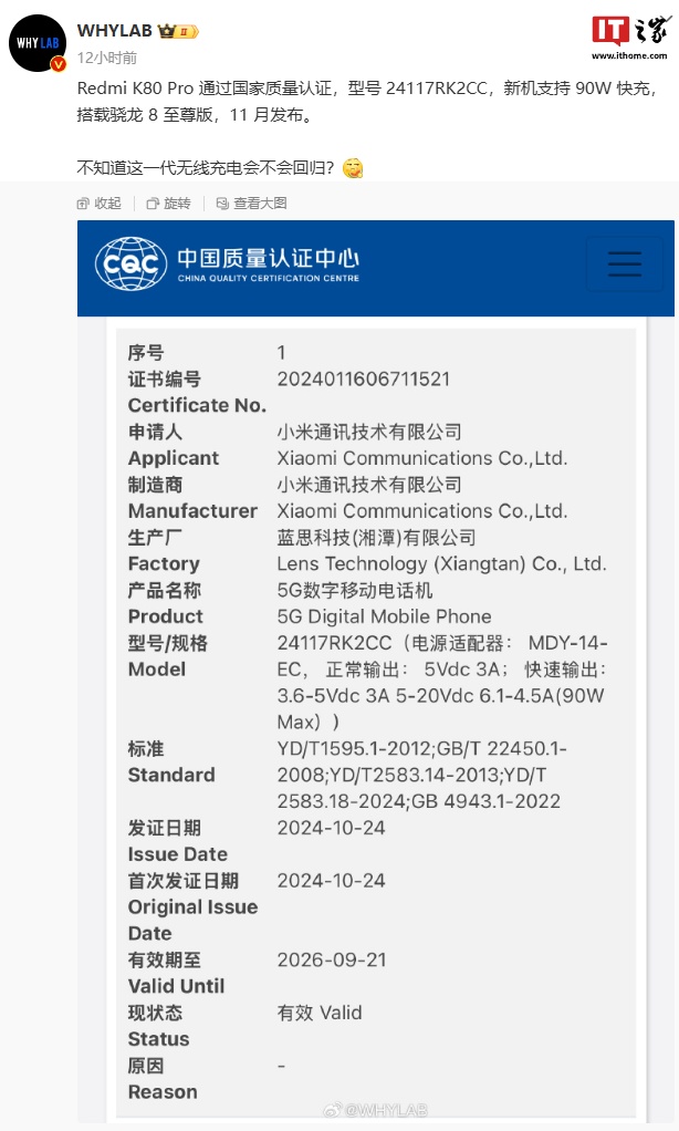 IT之家 10 月 25 日消息,一款型号为 24117RK2CC 小米新机于 10 月 24 日通过 3C 认证,博主 @WHYLAB 透露该机为 Redmi K80 Pro,搭载骁龙 8 至尊版处理器,11 月发布。